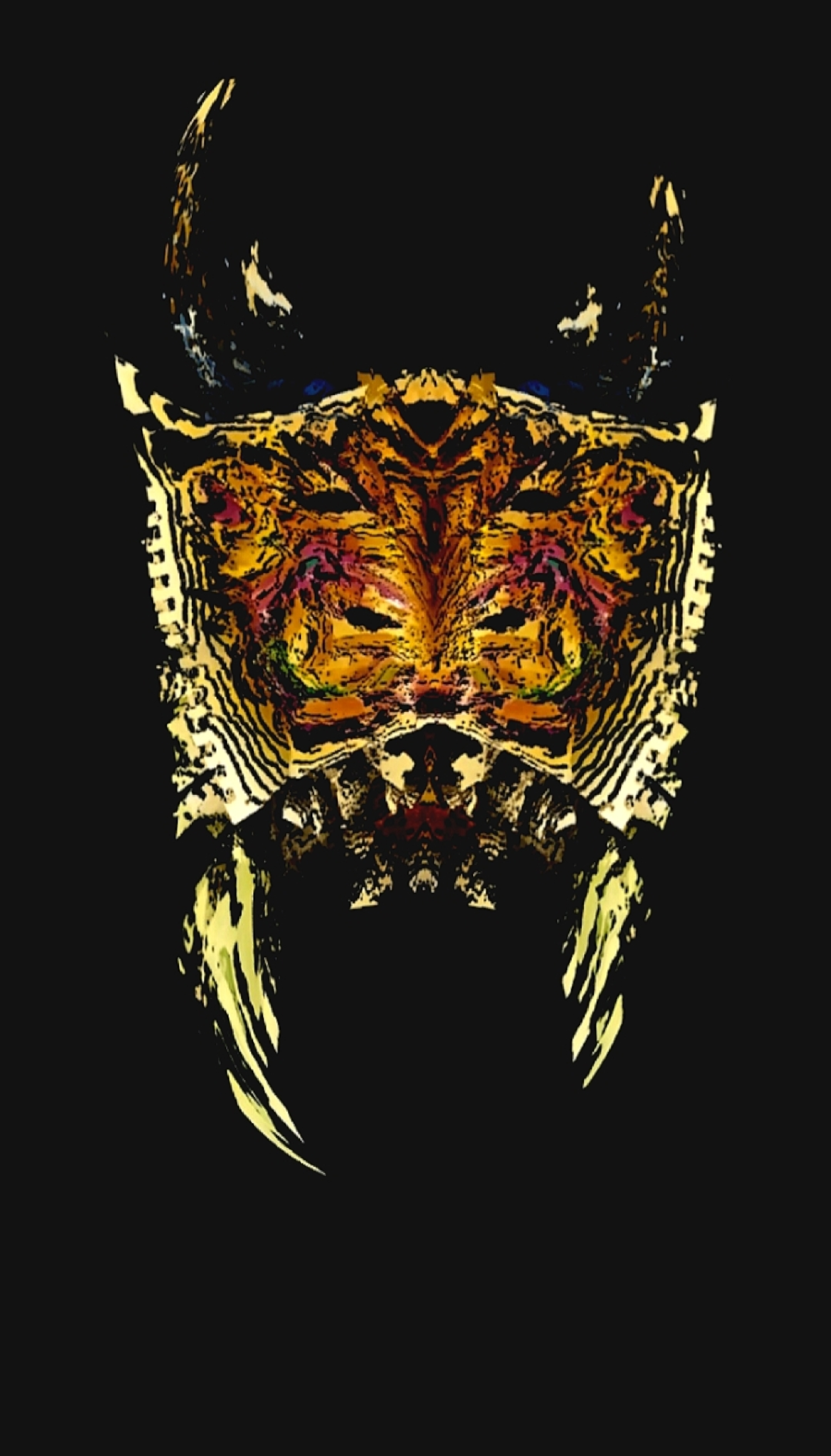 From a distance, the symmetry reveals a hidden mask — a silent observer within the colors. The illusion shifts as you move, blurring the line between what is seen and what is imagined.