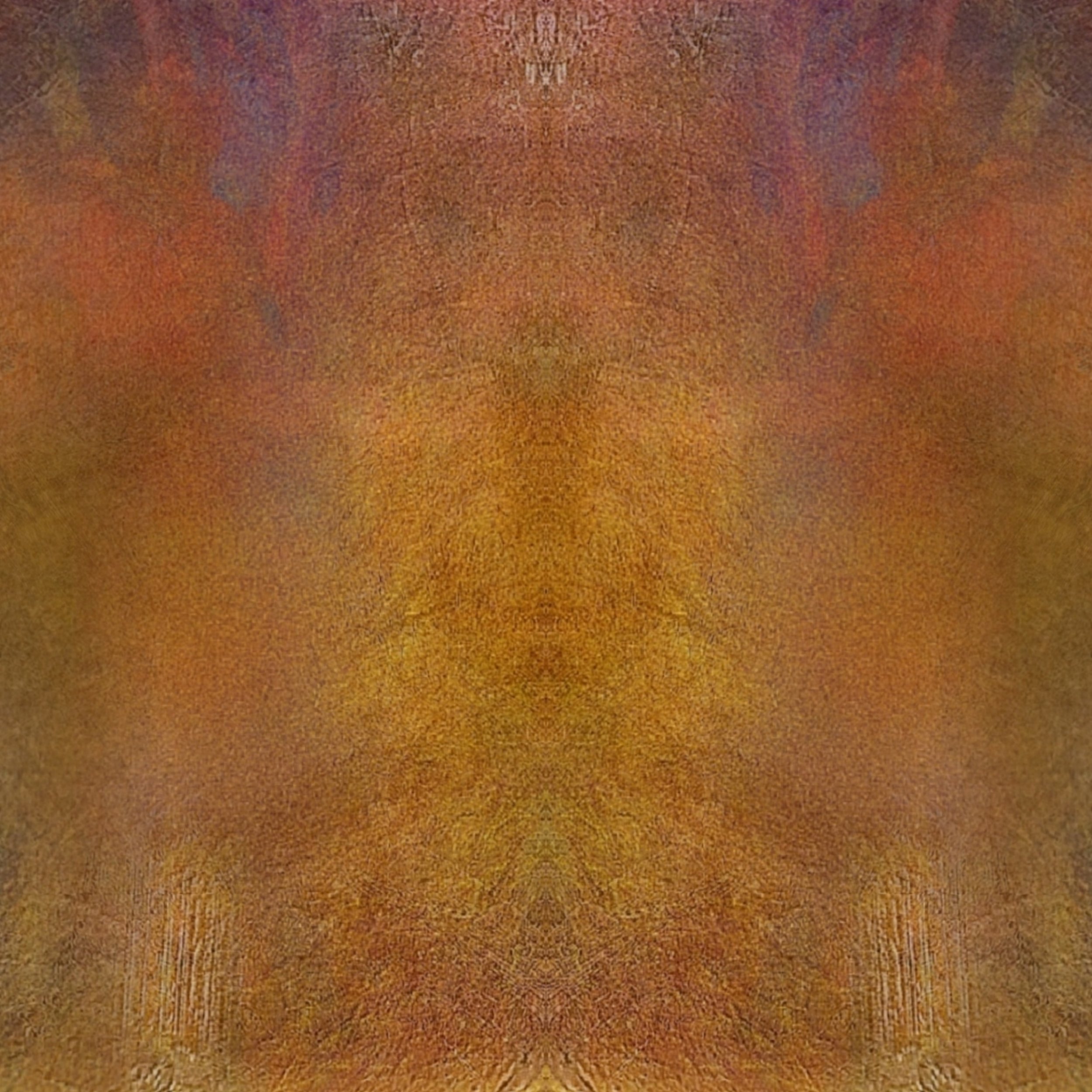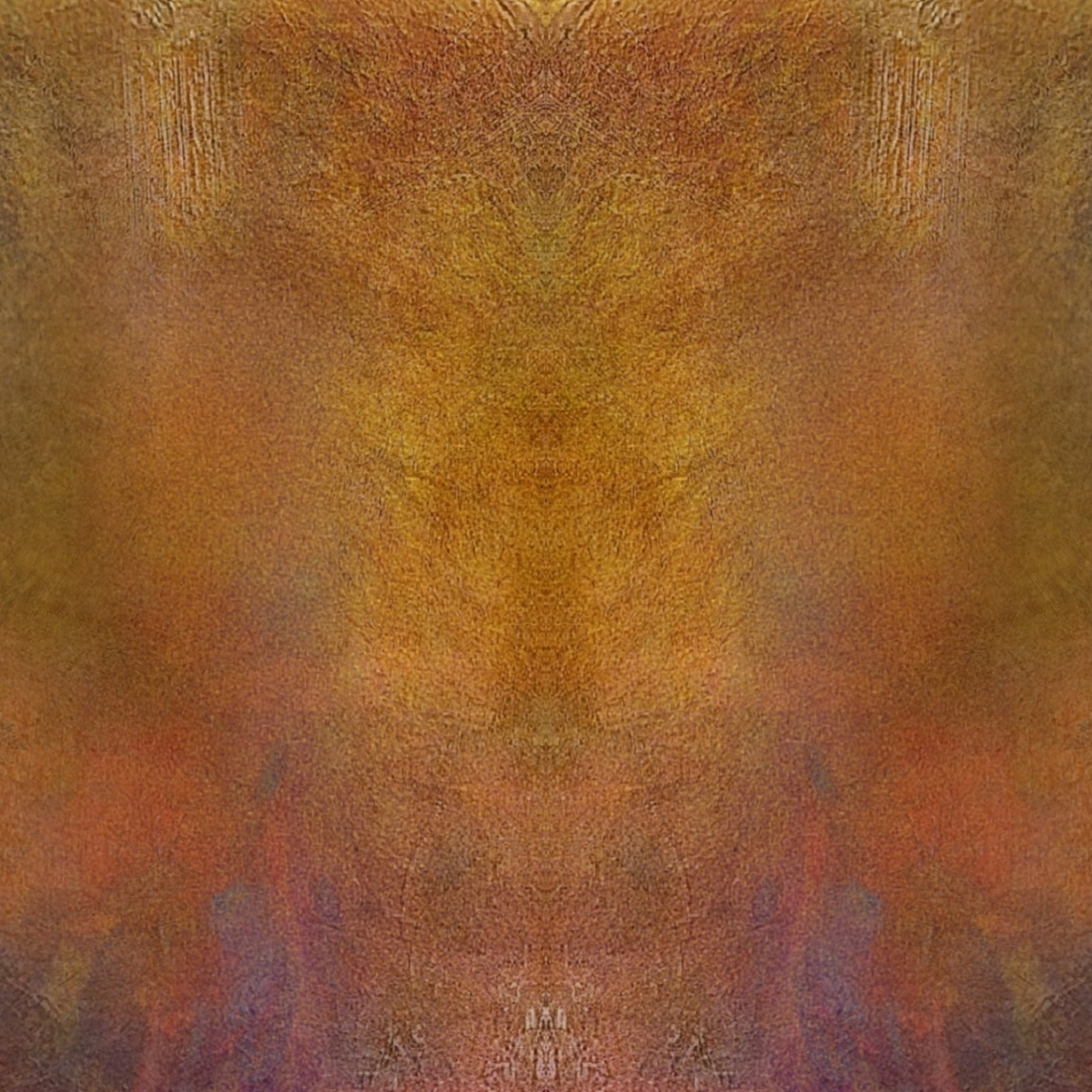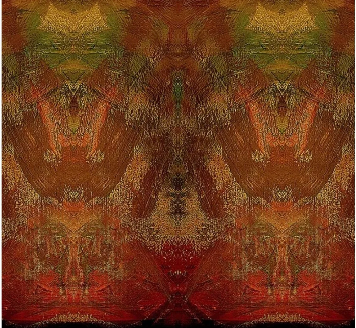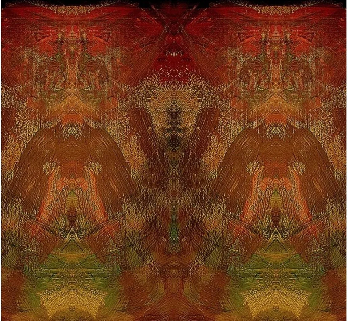 This artwork reveals two identities within a single image. When viewed upright, warm tones and mirrored textures suggest the presence of a mask — a silent figure emerging from the depths. Rotated, the same forms shift into something entirely different: wings, a creature, or an ancient guardian watching from behind the surface.