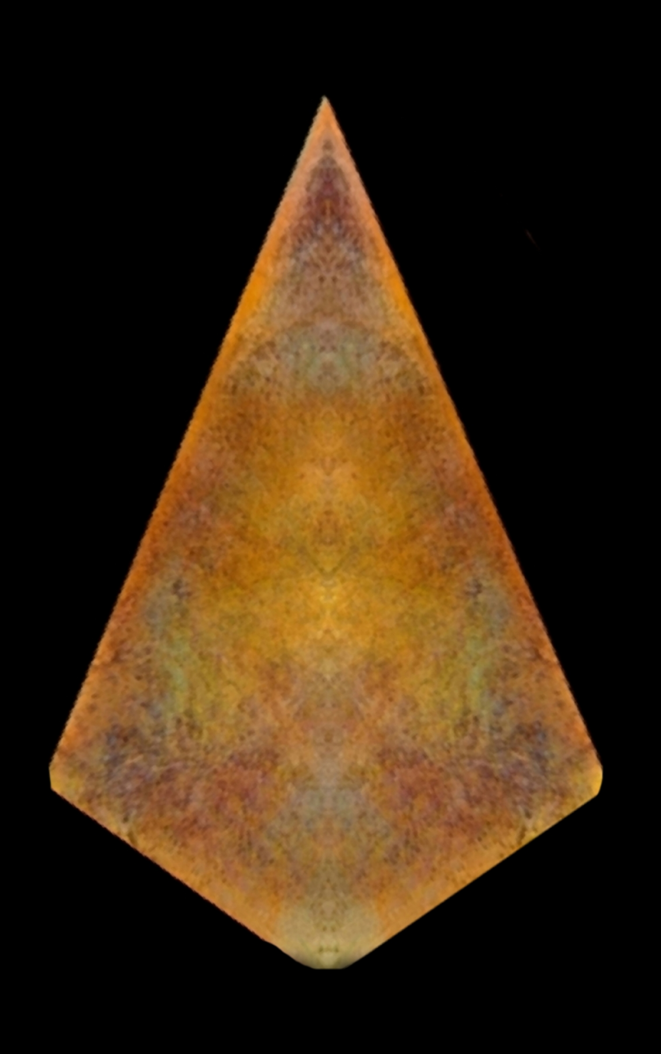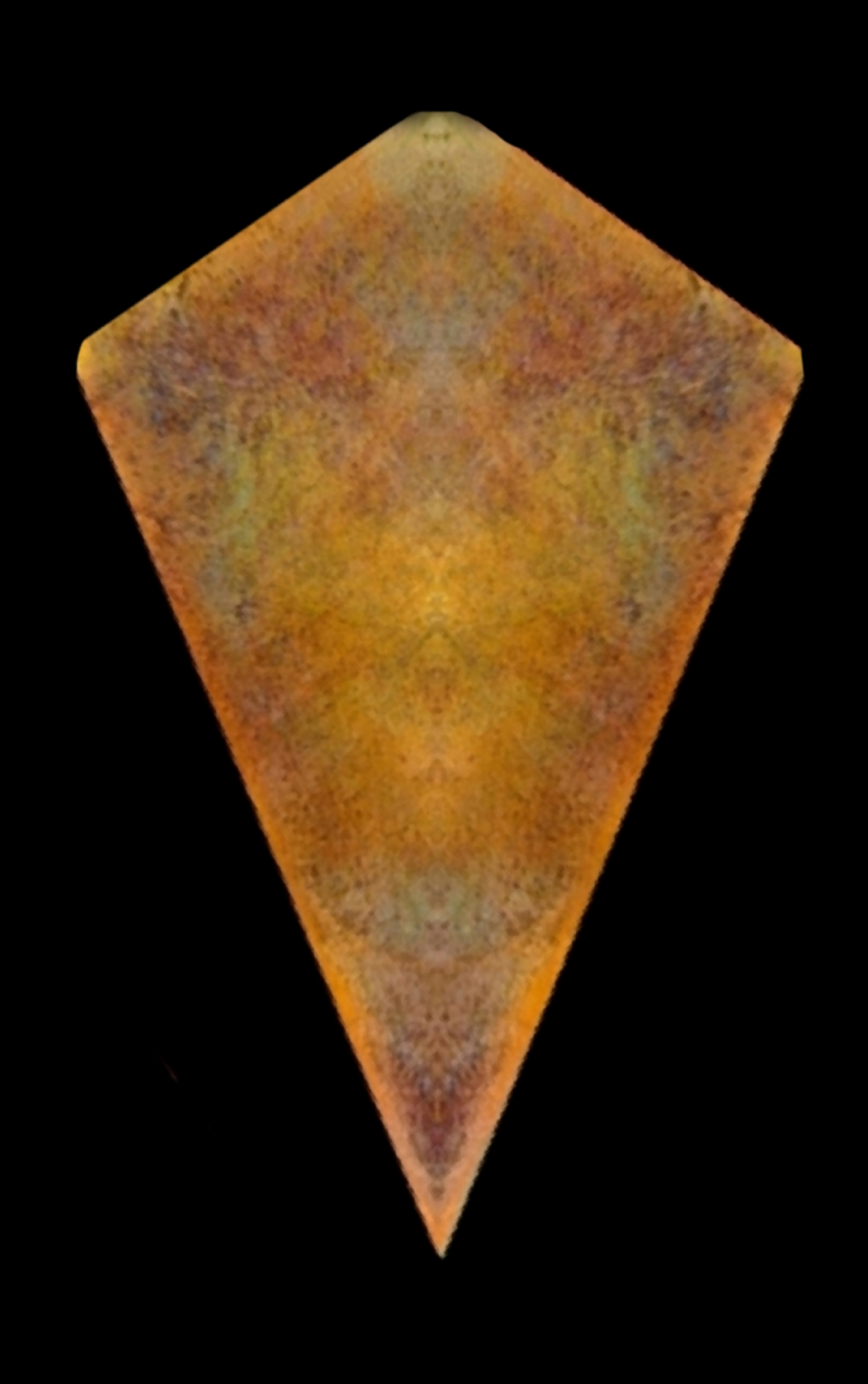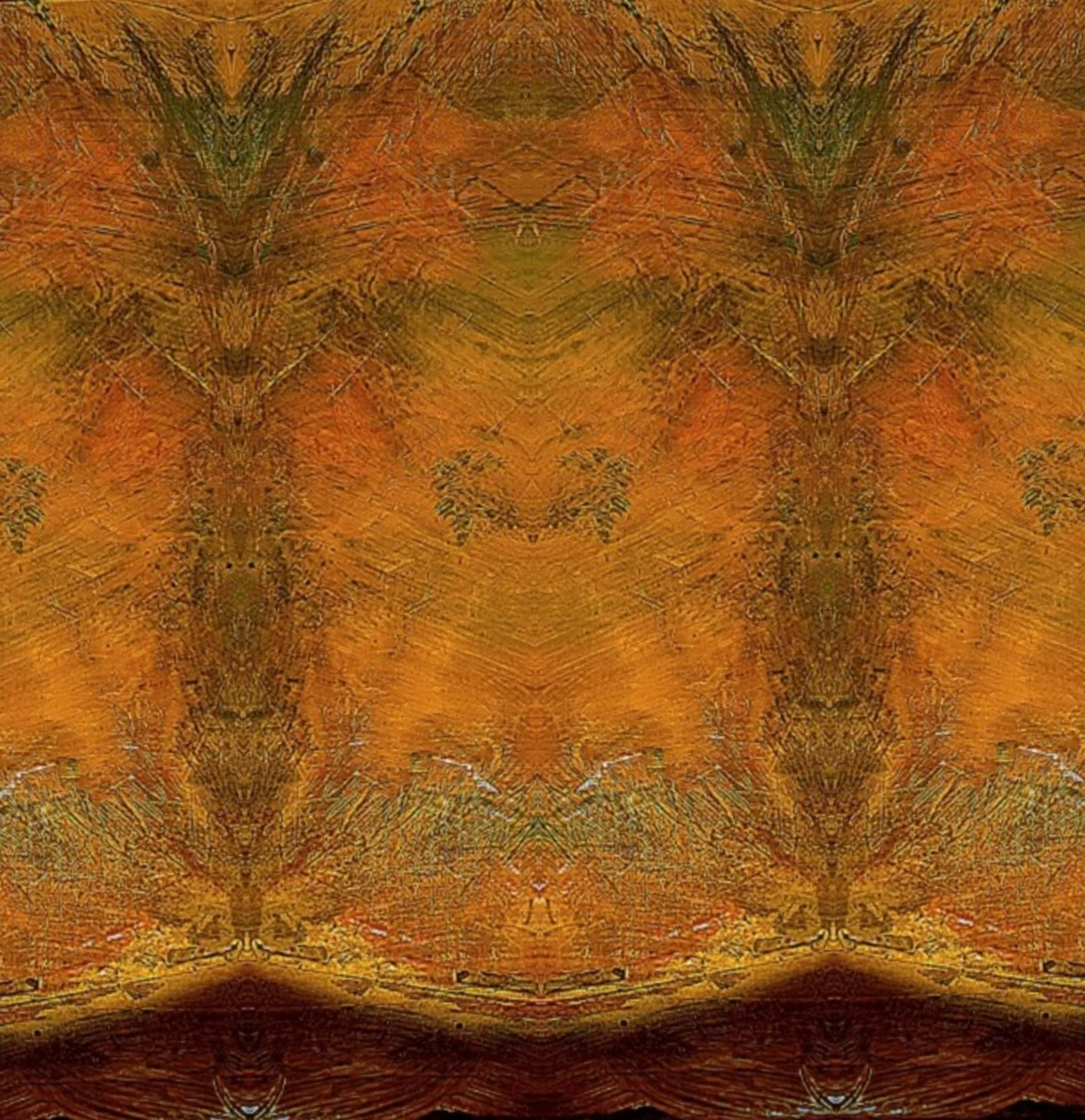 This artwork reveals two identities within a single image. When viewed upright, warm tones and mirrored textures suggest the presence of a mask — a silent figure emerging from the depths. Rotated, the same forms shift into something entirely different: wings, a creature, or an ancient guardian watching from behind the surface.